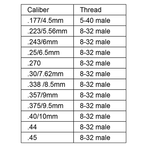 .177, .22, 6 mm, .25, .27, .30, .338, .35, .357, .40, .44, .45, .50 cal.