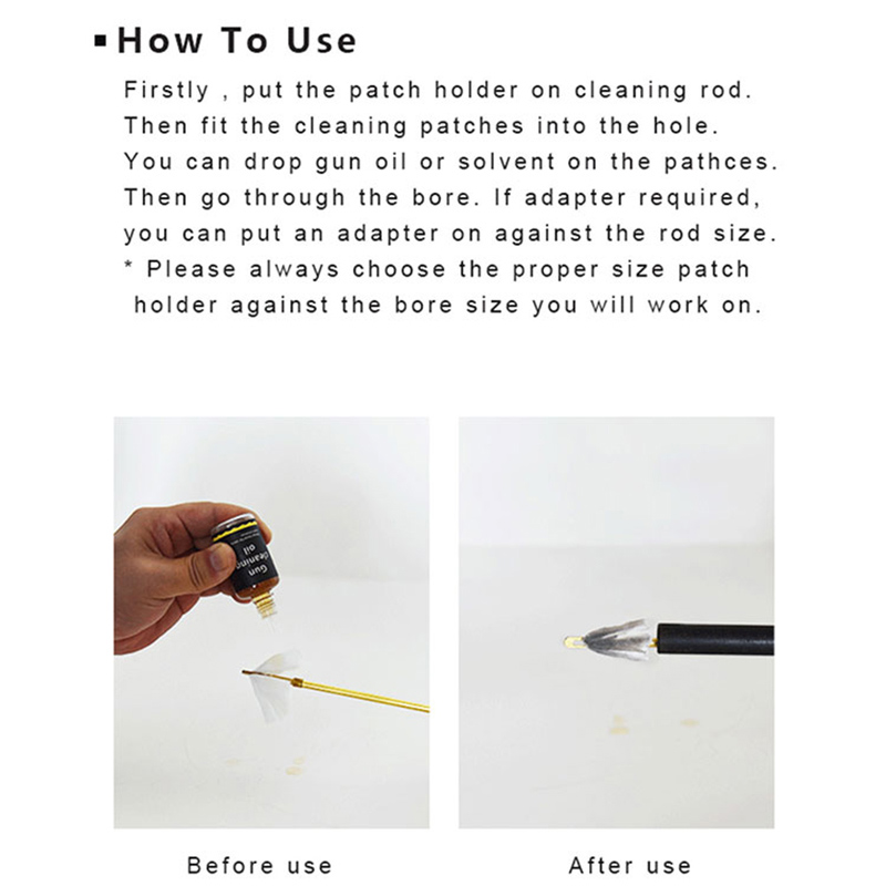 ● Los soportes/puntas para parches de limpieza de armas con ranuras de 4 tamaños pueden cumplir con calibres desde .177cal./4,5 mm hasta calibre 12, aptos para rifles, pistolas y escopetas.