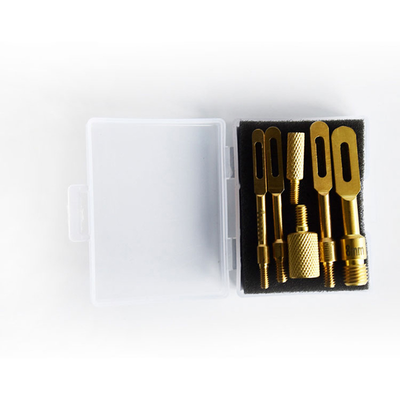 ● Los 4 soportes para parches: 4 mm en macho 5-40, aptos para rifles .177-.223; 5 mm está en macho 8-32, se adapta a .223-.270cal. rifles; 6 mm en macho 5-40, apto para rifles .270-.357cal, pistolas .357-.45cal.; 8 mm es macho 5/16-24, se adapta a todos los calibres de escopeta y pistolas desde .357cal. y arriba.