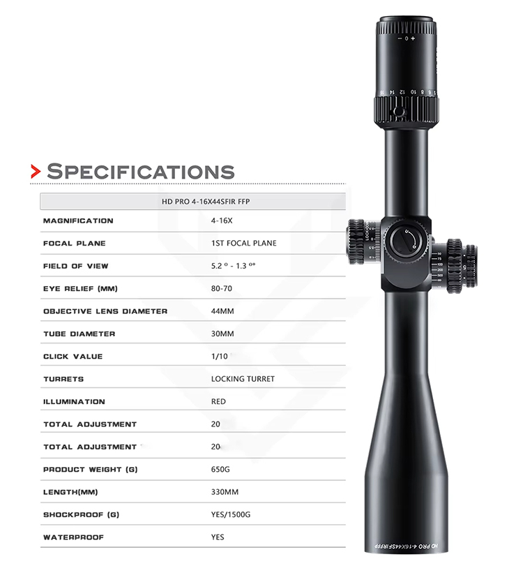 Óptica HD PRO 4-16X44 SFIR FFP Alcance de caza de alta resistencia a los golpes Tiro táctico de largo alcance Tubo de 30 mm